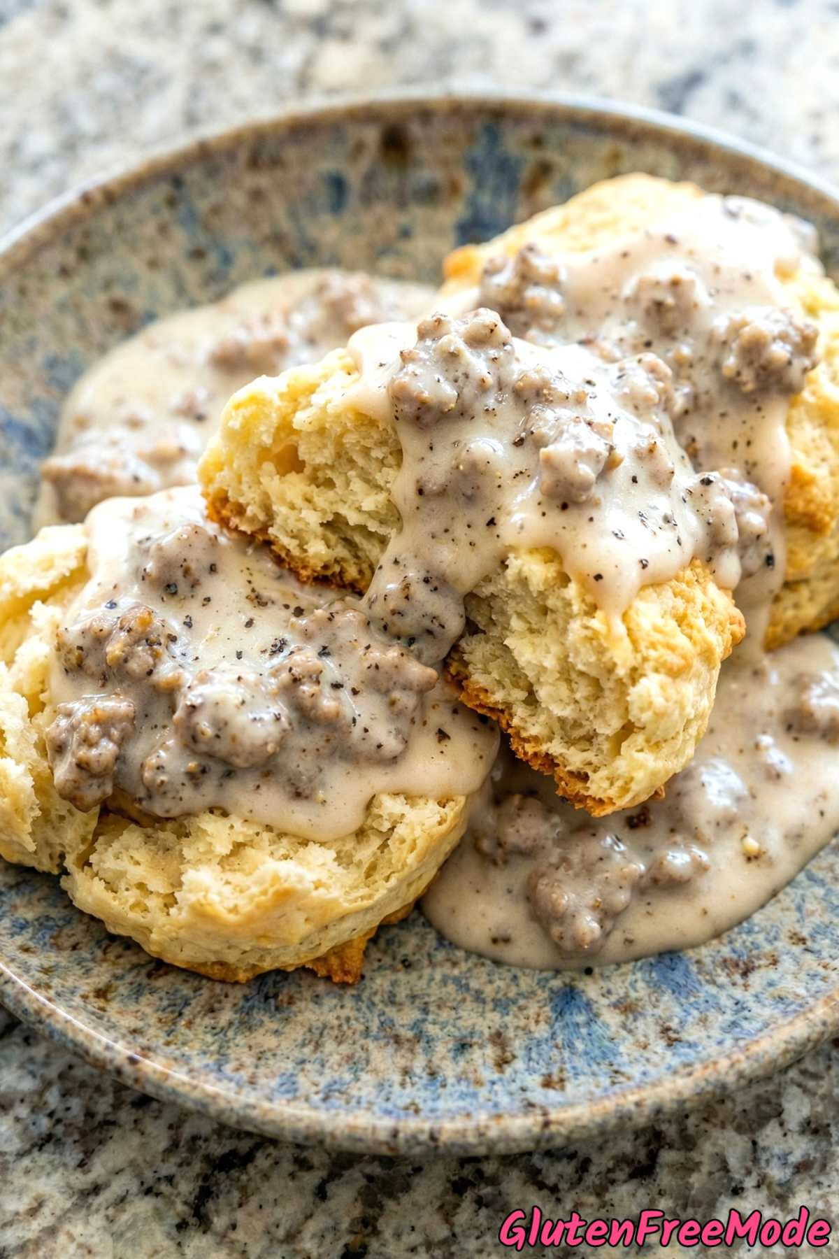 - Split the warm biscuits in half and place on plates. Ladle the sausage gravy generously over the top and serve immediately.