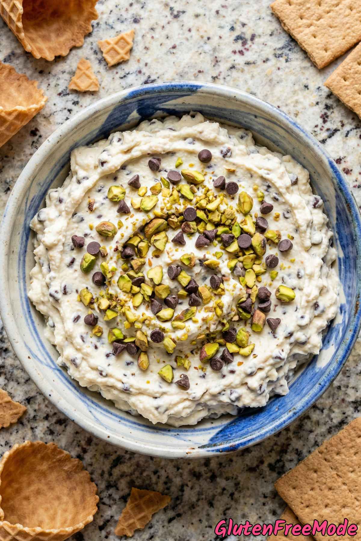 - Transfer the dip to a serving bowl. Sprinkle the chopped pistachios and a few extra mini chocolate chips on top.