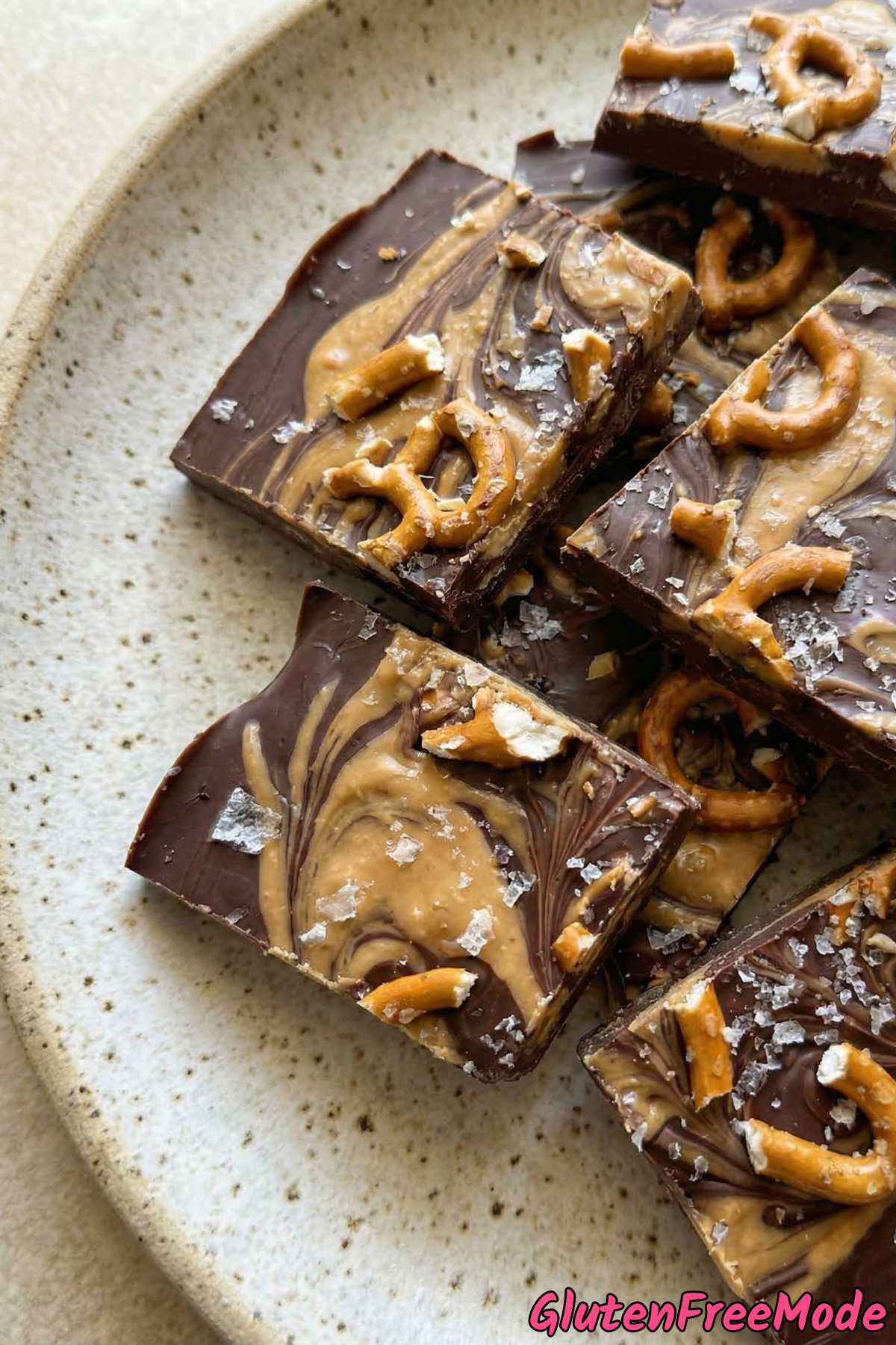 - Drop spoonfuls of peanut butter mixture over the chocolate layer, then swirl with a toothpick to create a marbled effect. Sprinkle with crushed pretzels and flaky sea salt.