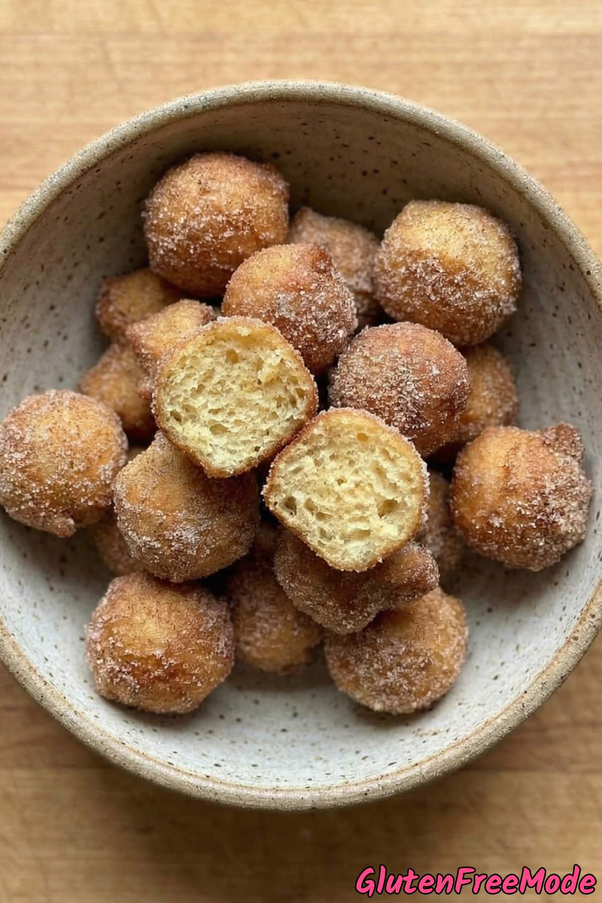The dough comes together on the stovetop in just a few minutes using gluten free all purpose flour and xanthan gum. Then you drop small pieces into hot oil, fry them until golden, and roll them in cinnamon sugar.