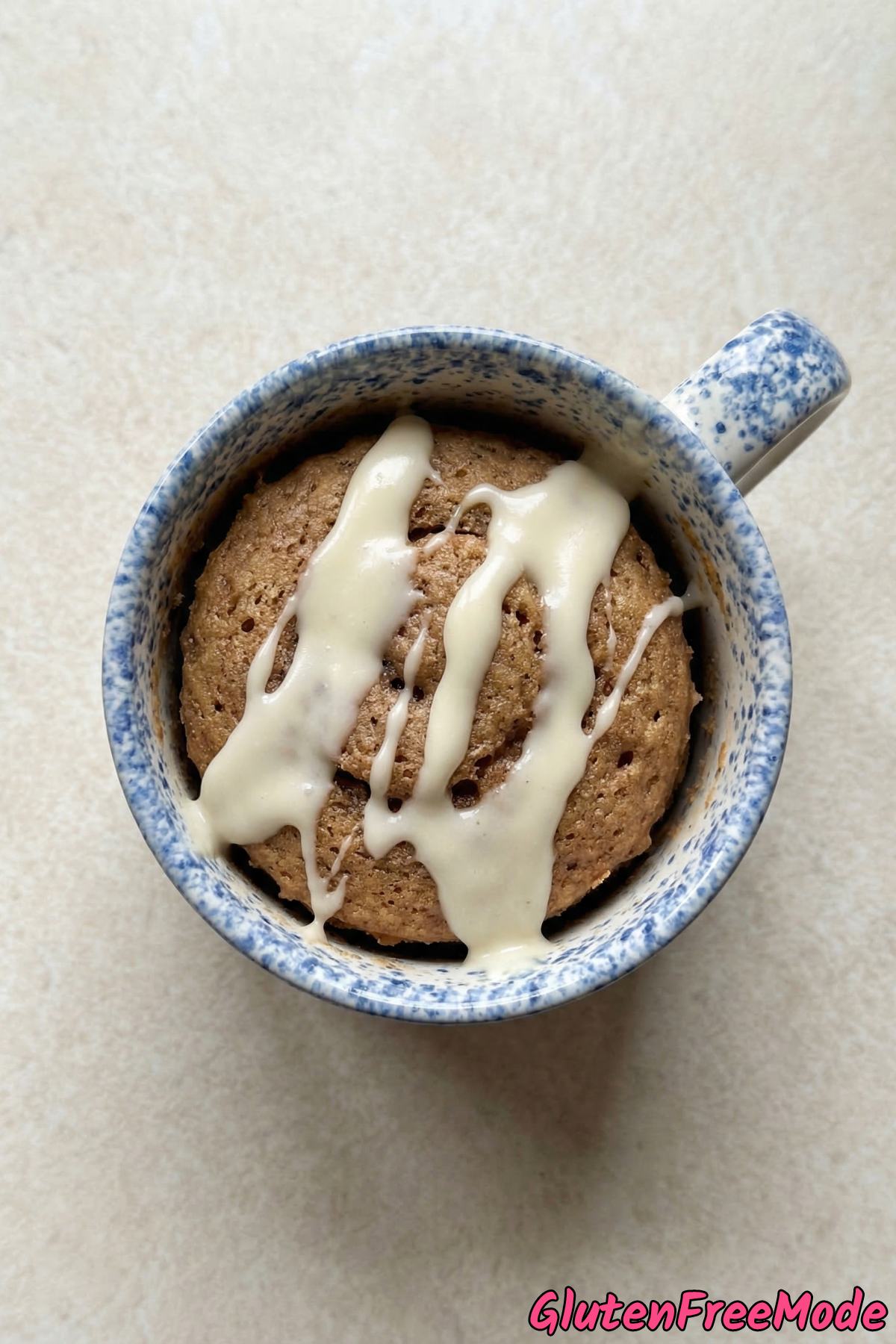 - Once the mug cake is done, let it cool for 1 minute, then drizzle the cream cheese frosting on top and serve immediately.