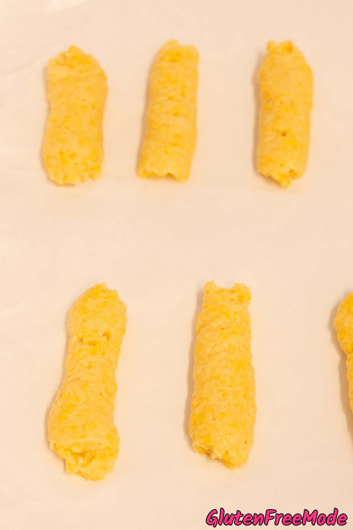 - Add the mixture to a piping bag. Pipe 1 to 2-inch tubes onto the lined baking sheet.