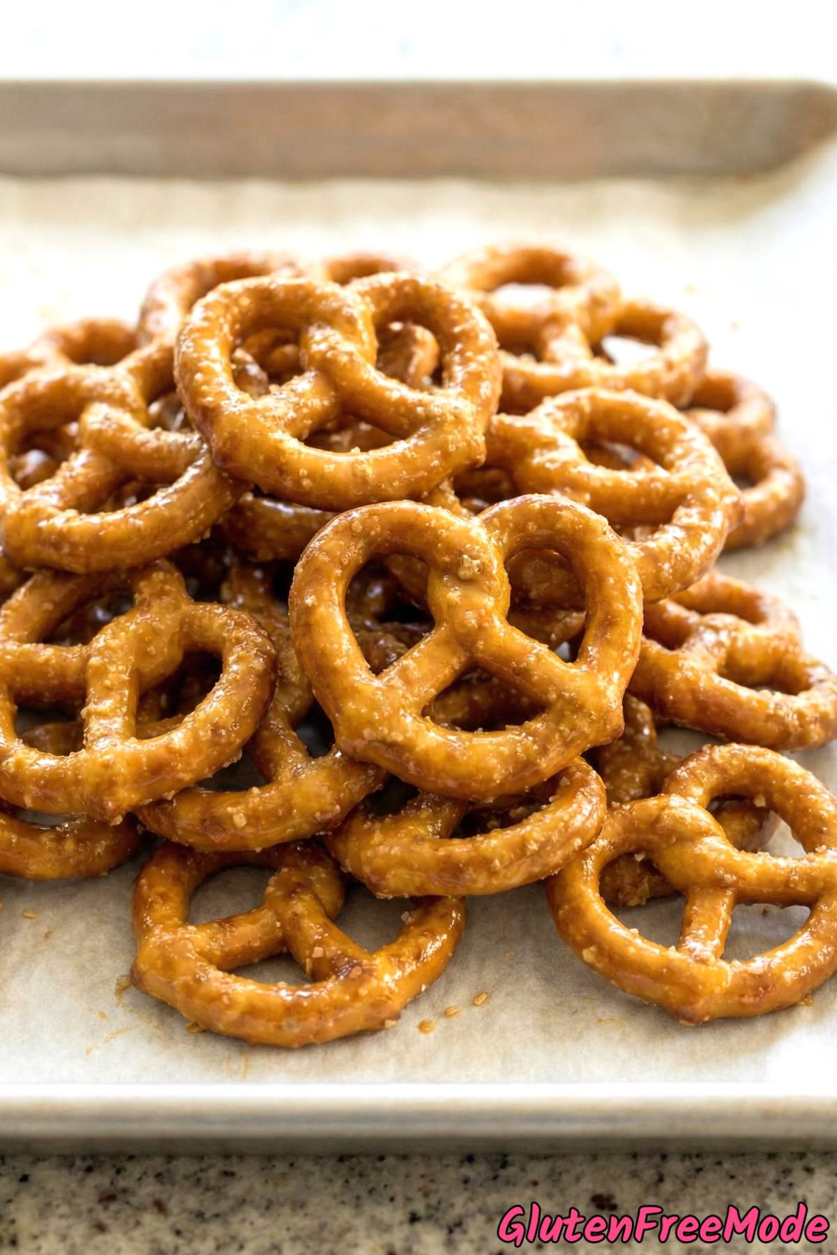 Snyder’s of Hanover gluten free pretzels and Glutino pretzels are both popular choices that hold up really well with the honey mustard coating. You want a sturdy pretzel that won’t fall apart when tossed with the wet mixture.