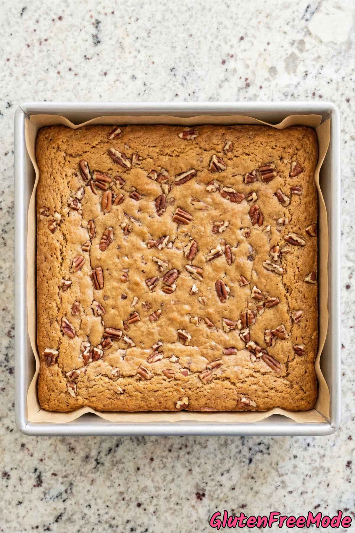 - Spread the batter evenly into the prepared pan, top with reserved pecans, and bake for 22 to 25 minutes until the edges are golden.