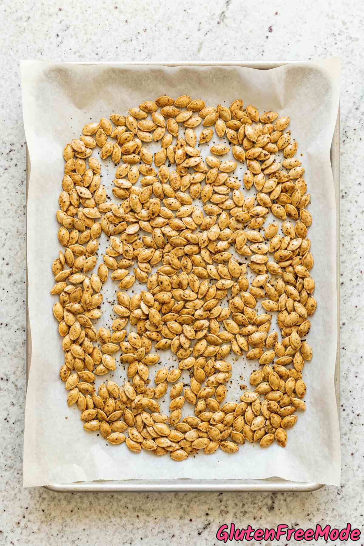 - Spread the seeds in a single layer on the prepared baking sheet.