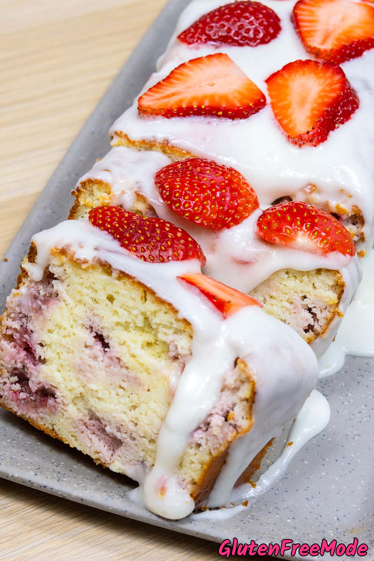 - Let the cake cool in the pan for 30-40 minutes. Meanwhile make the glaze- add the powdered sugar sweetener, hot water, and lemon juice into a small bowl. Whisk until a smooth white glaze forms. Pour the glaze over the cooled cake. I recommend adding more sliced strawberries on top.