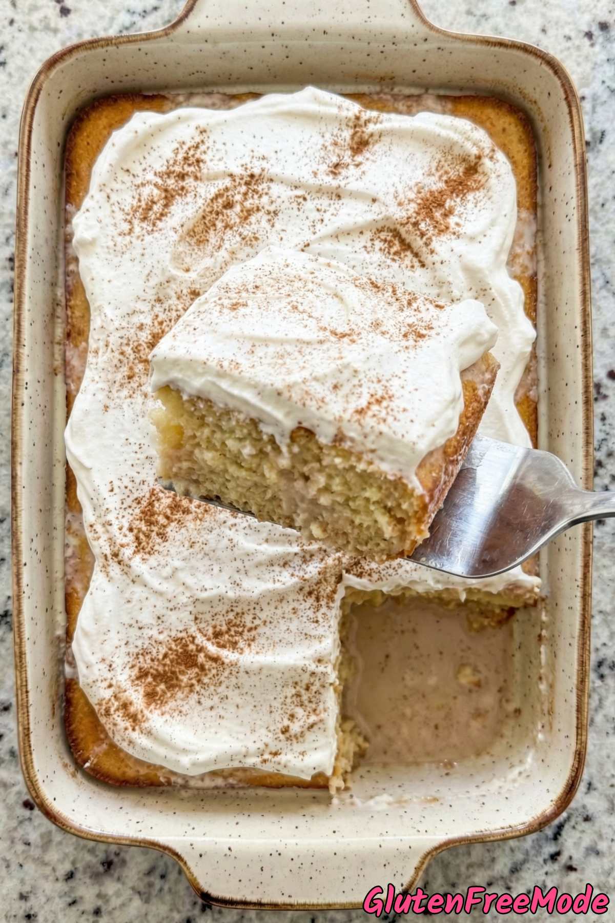 That Cinnamon Whipped Cream Topping – The homemade whipped cream on top isn’t just plain. It’s lightly sweetened and spiced with ground cinnamon, which adds a warm flavor that pairs perfectly with the creamy, milky cake underneath.