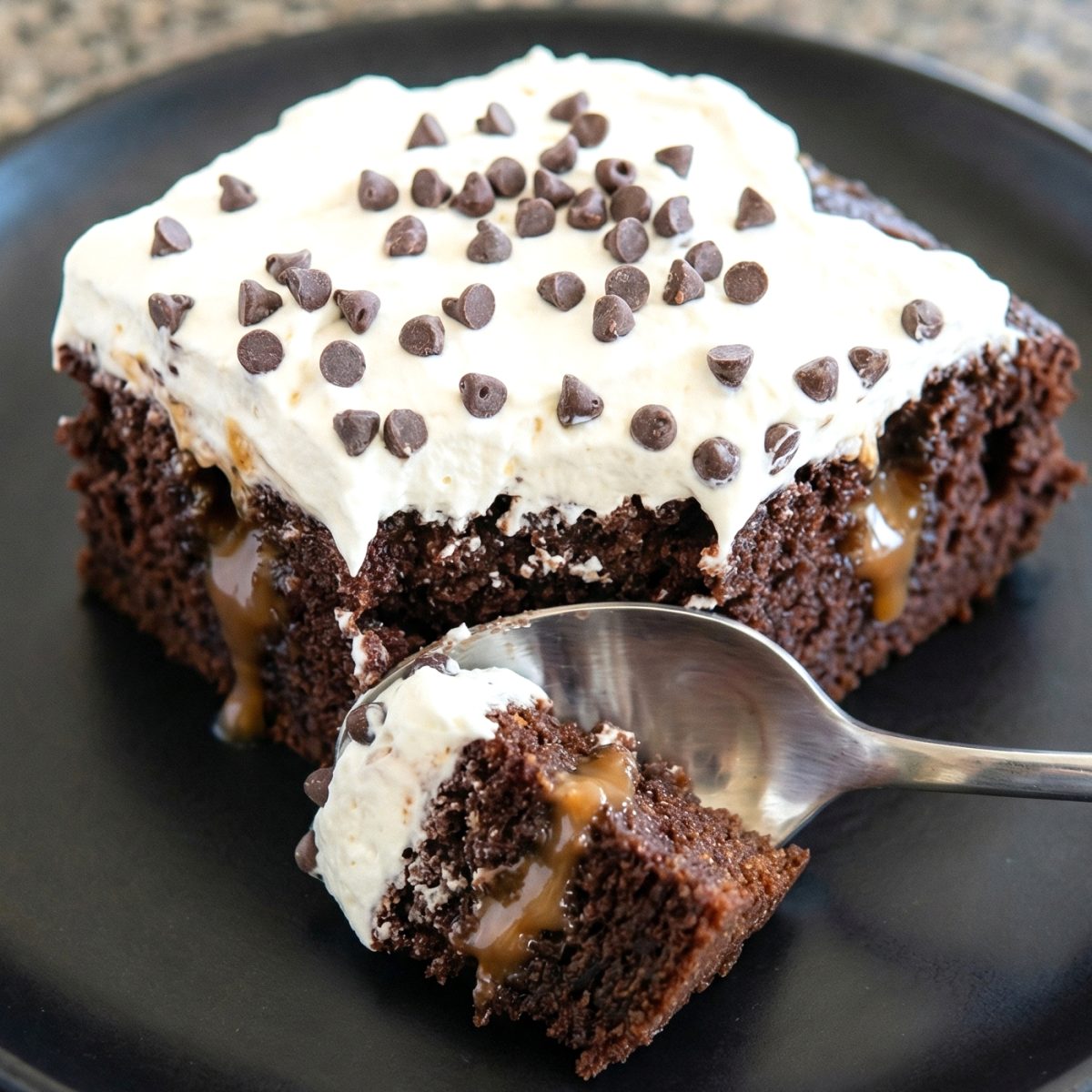 Keyword: chocolate caramel cake, easy dessert, gluten-free, poke cake