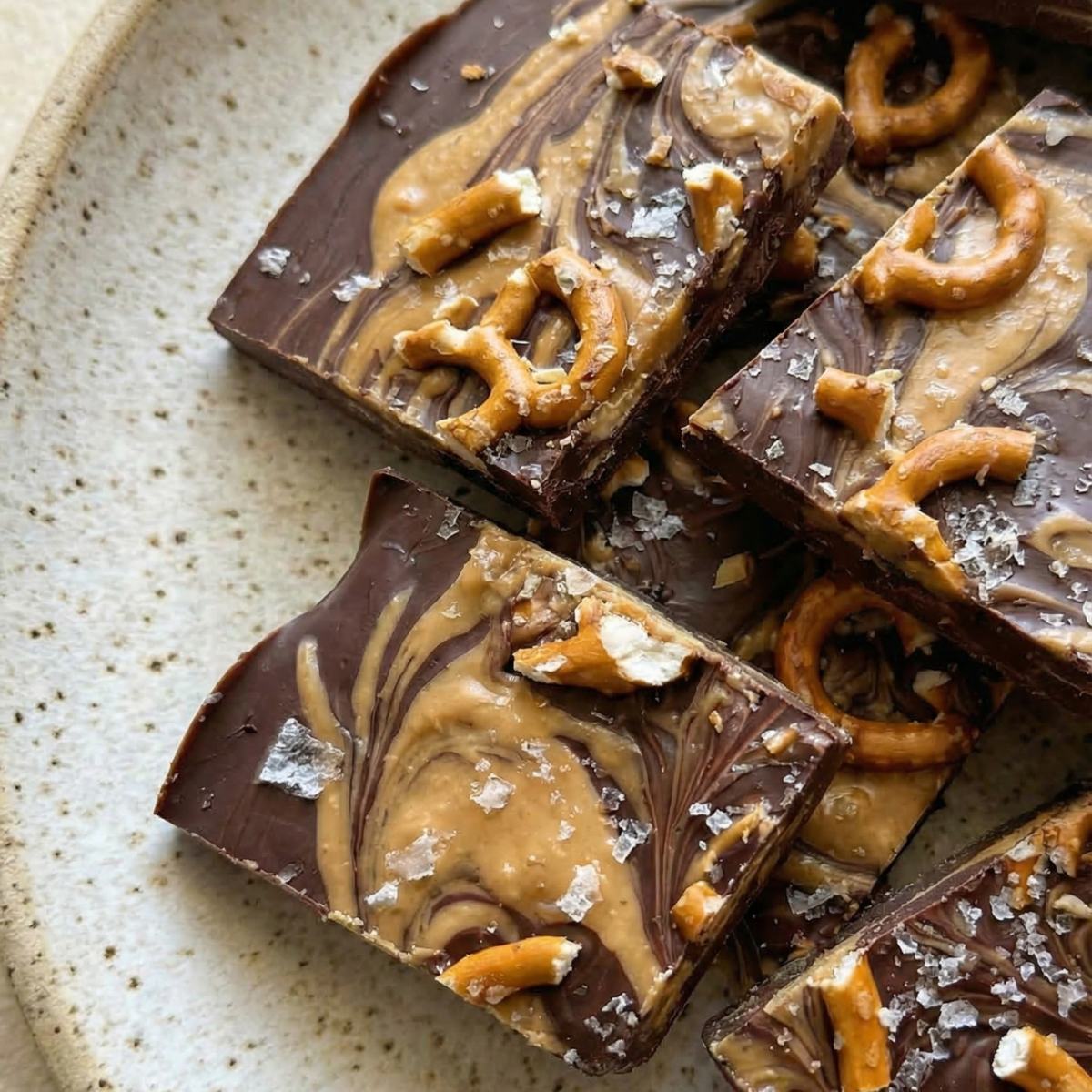 Drop spoonfuls of peanut butter mixture over the chocolate layer, then swirl with a toothpick to create a marbled effect. Sprinkle with crushed pretzels and flaky sea salt.
