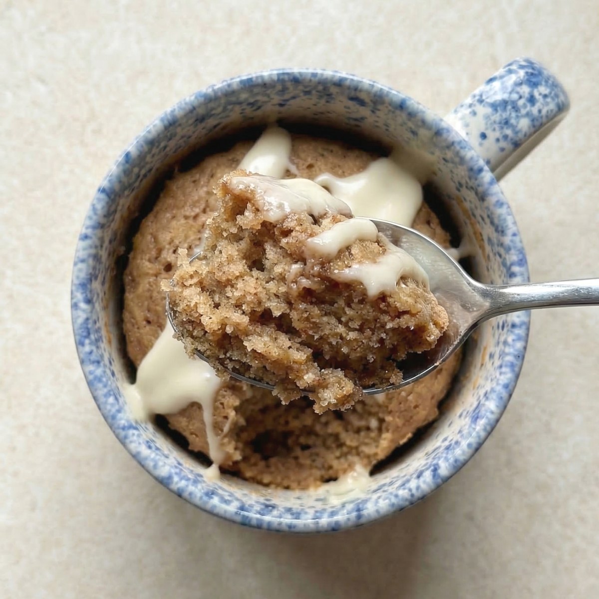 Once the mug cake is done, let it cool for 1 minute, then drizzle the cream cheese frosting on top and serve immediately.