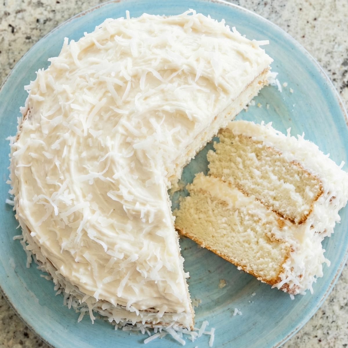 Place one cake layer on a serving plate. Spread a generous layer of frosting on top. Place the second layer on top and frost the top and sides with the remaining frosting. Press the shredded coconut all over the top and sides of the cake. Refrigerate for 30 minutes before slicing.