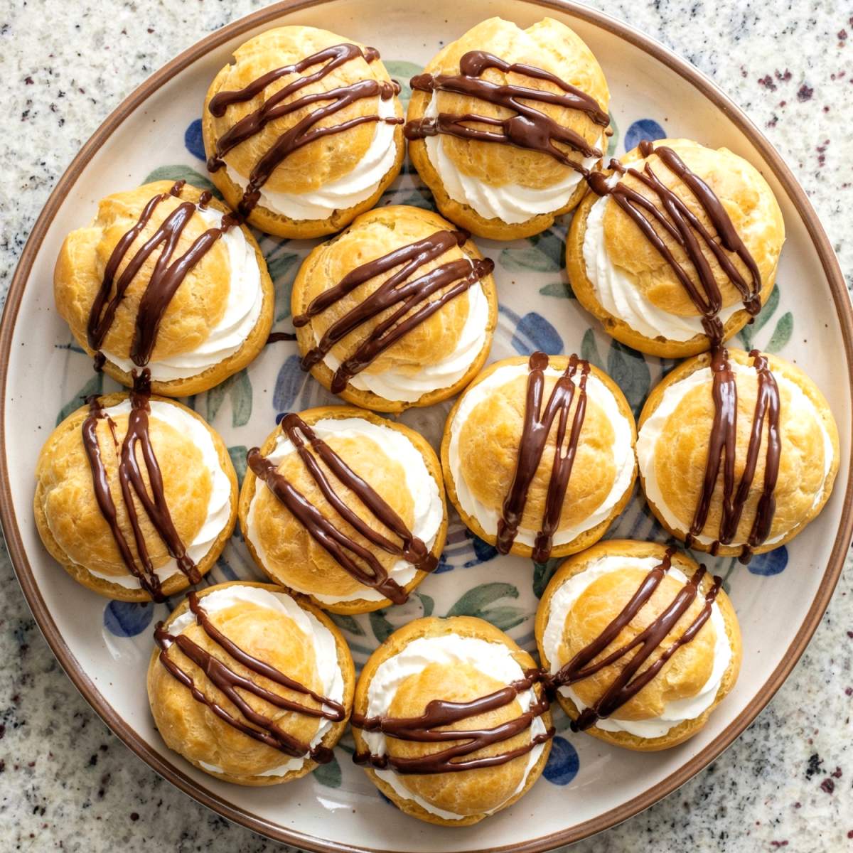 Melt chocolate with heavy cream in 20-second microwave intervals, stirring until smooth. Drizzle the chocolate ganache over the top of each cream puff. Let set for 10 minutes before serving.