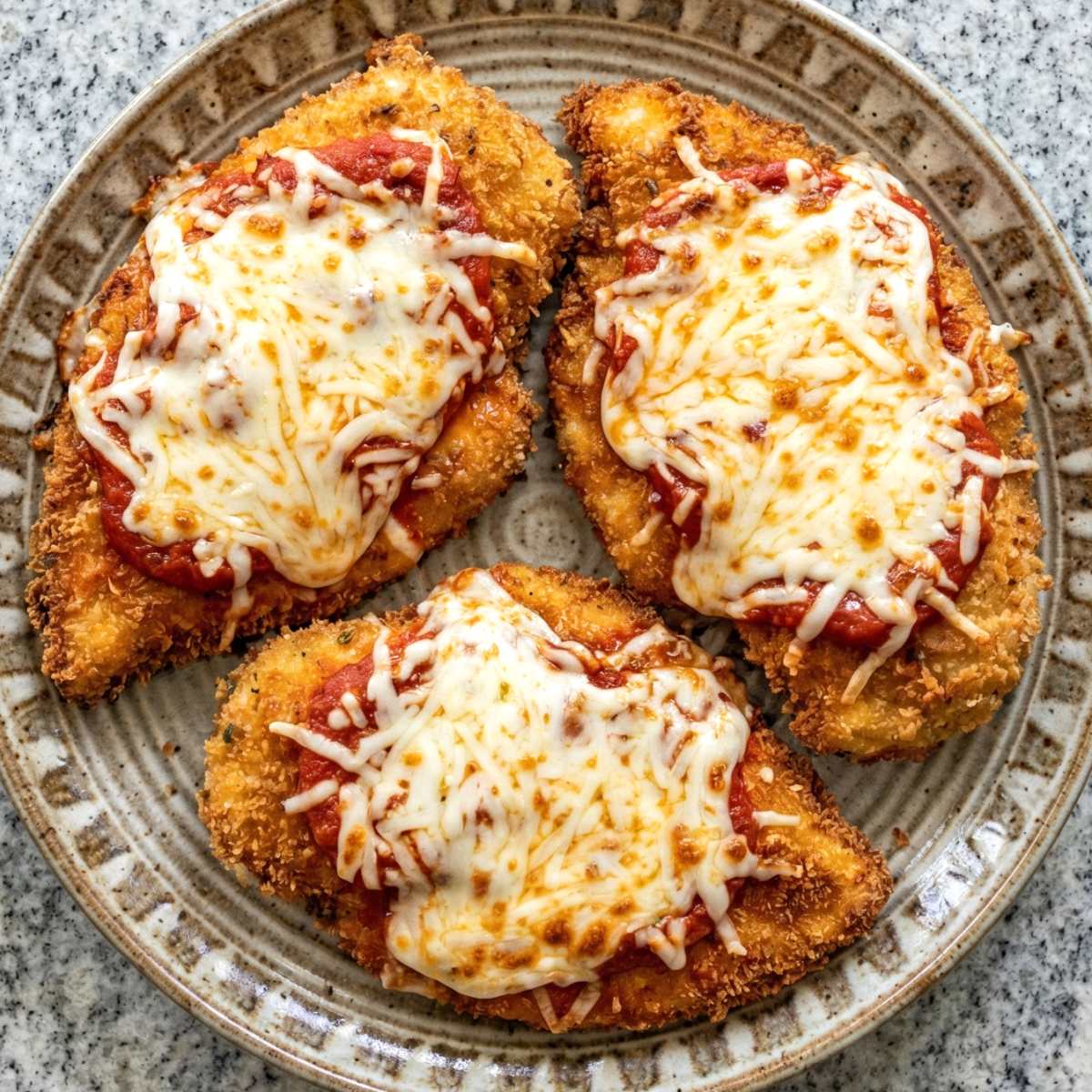 Transfer the crispy chicken to a baking sheet. Spoon a generous layer of marinara sauce over each piece and top with shredded mozzarella cheese.