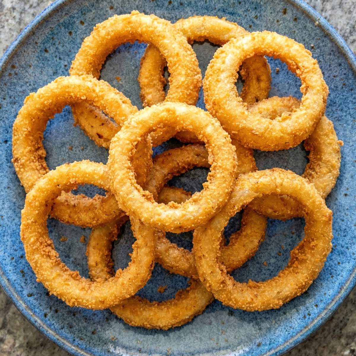 Dip the onion rings into the batter one at a time, letting the excess drip off, and carefully drop them into the hot oil.