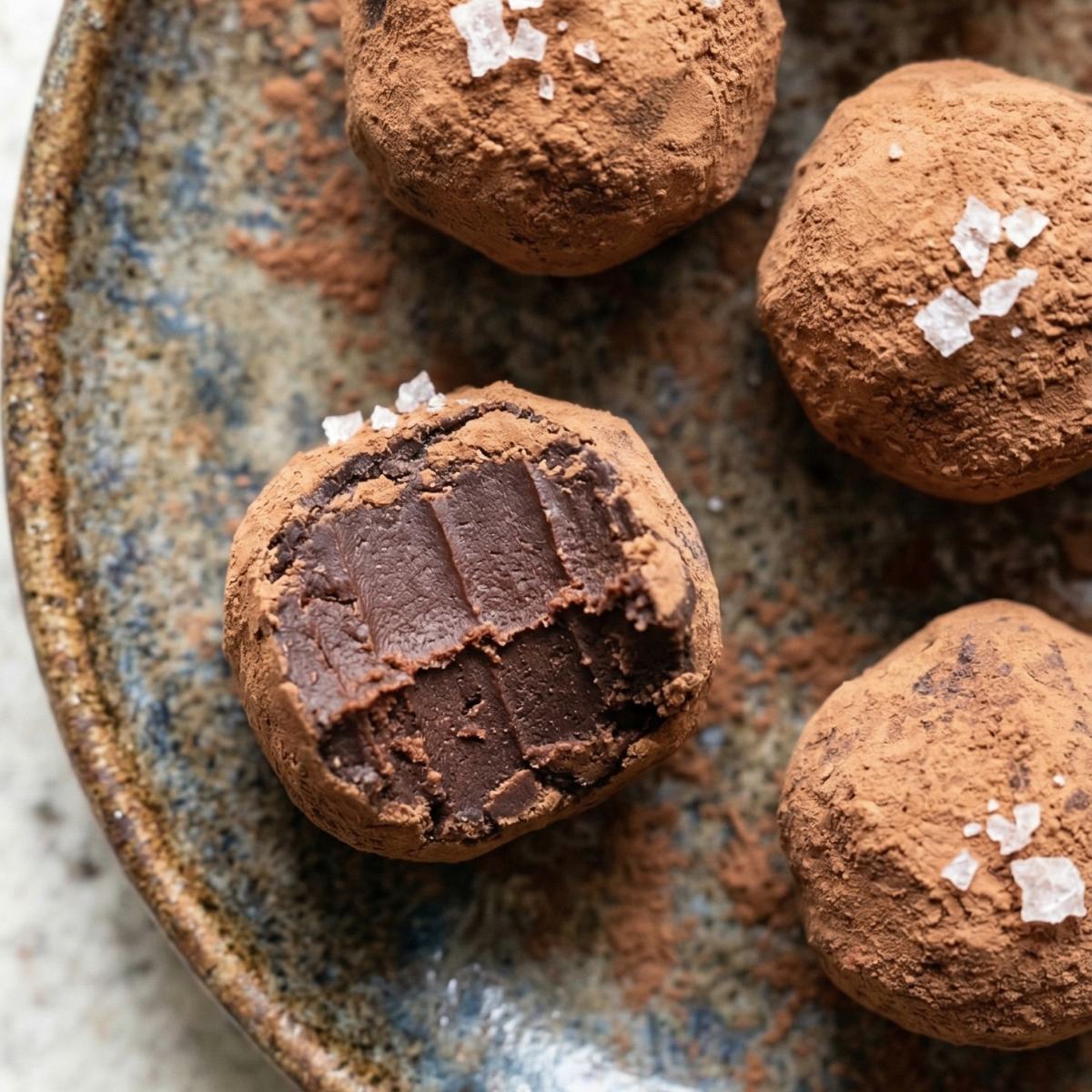 Roll each truffle in cocoa powder to coat, and press a tiny pinch of flaky sea salt into the top of each one.