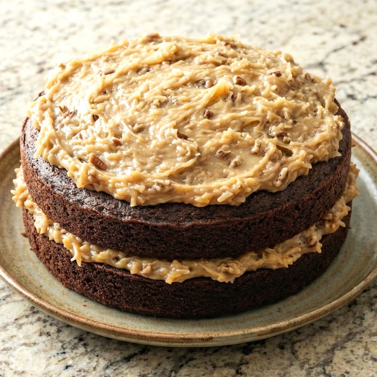 Place one cake layer on a plate, spread half the coconut pecan frosting over the top, place the second layer on top, and spread the remaining frosting over it. Serve at room temperature.