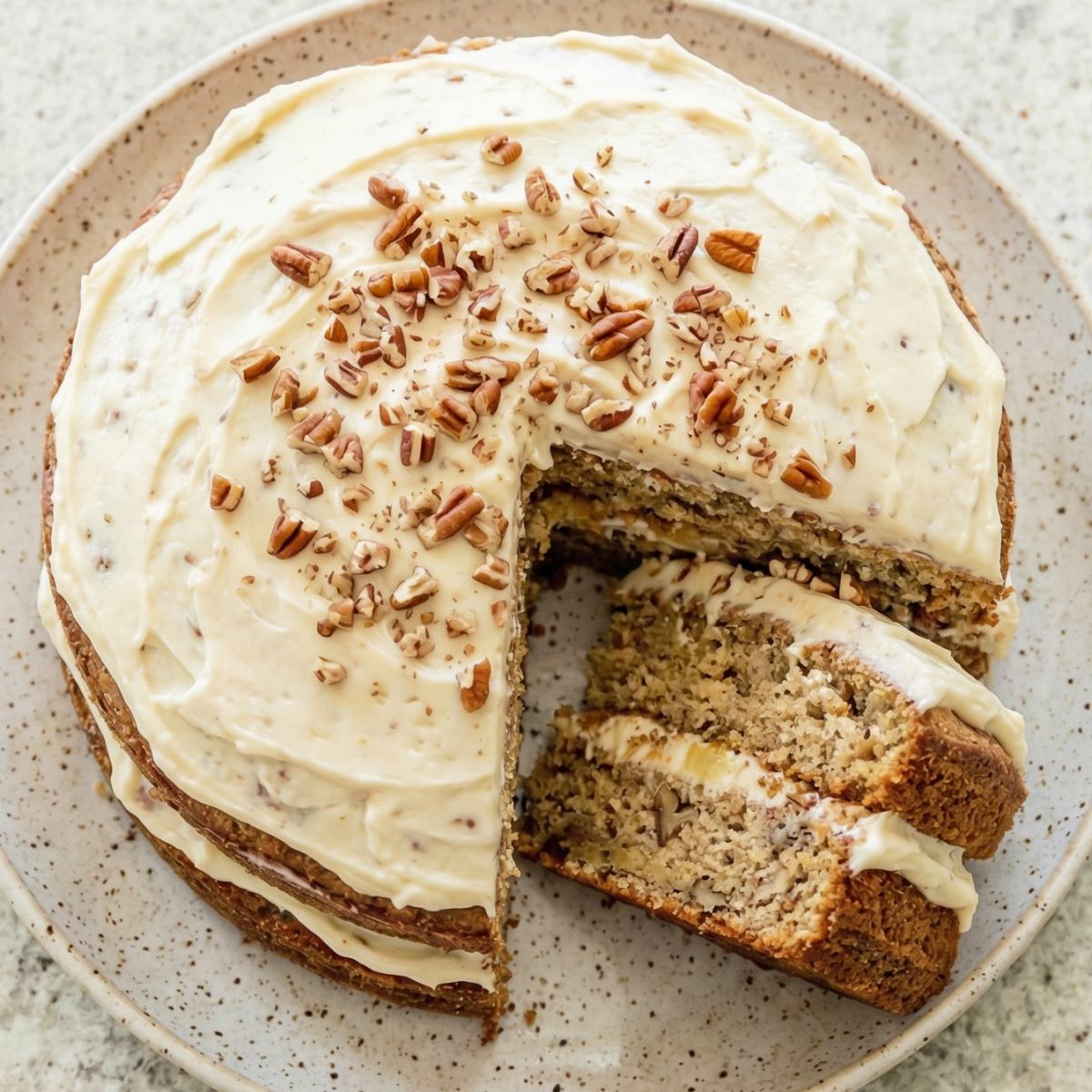 Place one cake layer on a serving plate. Spread a thick layer of frosting on top. Place the second layer on top and frost the top and sides with the remaining frosting. Sprinkle the chopped pecans over the top for garnish.