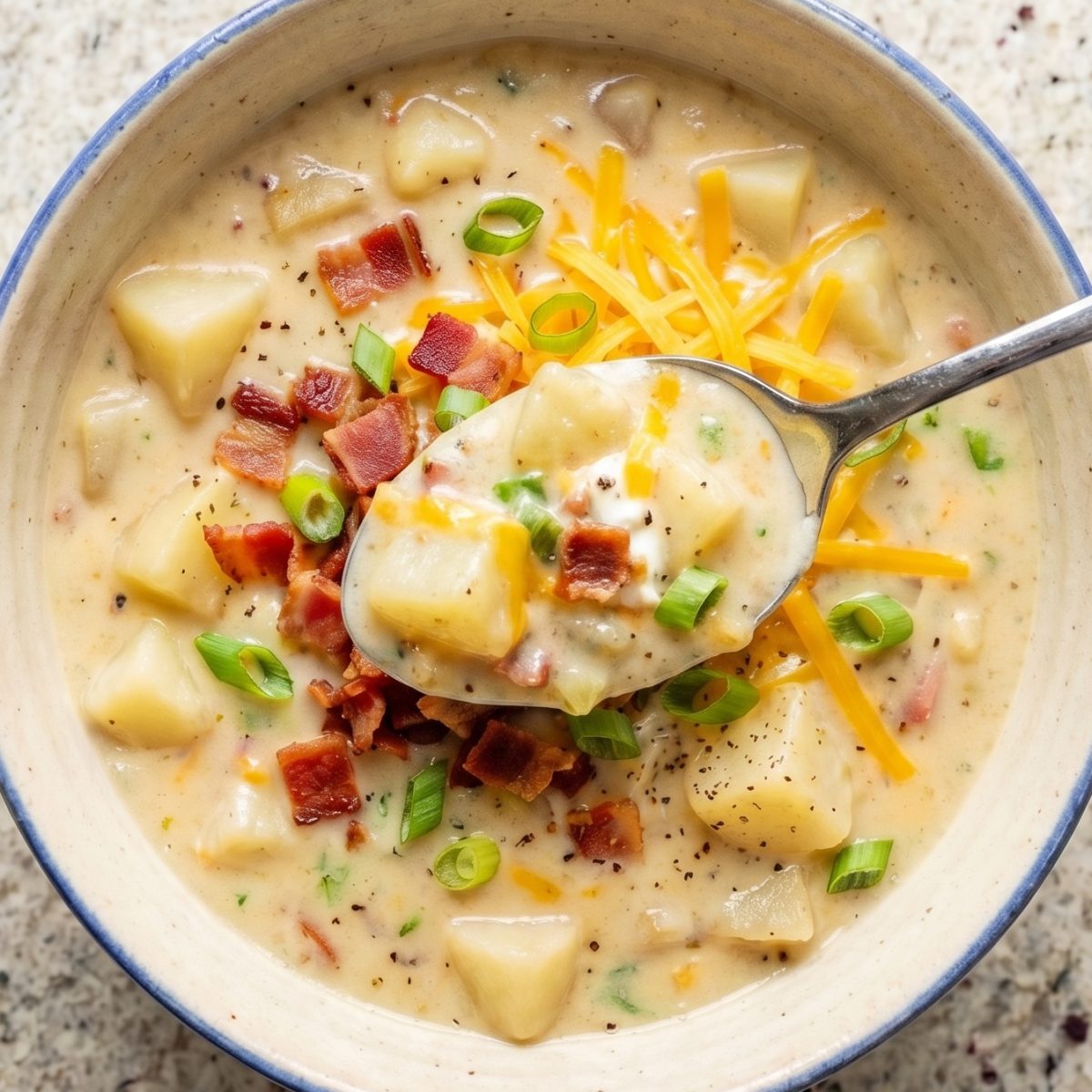 Season with salt and black pepper. Ladle into bowls and top with the reserved crispy bacon, sliced green onions, a dollop of sour cream, and extra shredded cheddar.