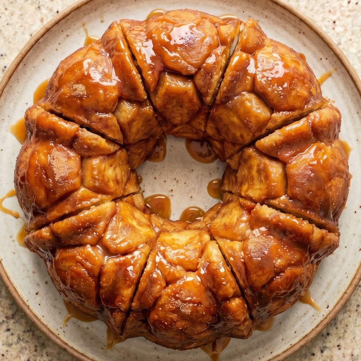 Place a serving plate upside down on top of the bundt pan, then carefully invert the monkey bread onto the plate. Serve warm and pull apart.