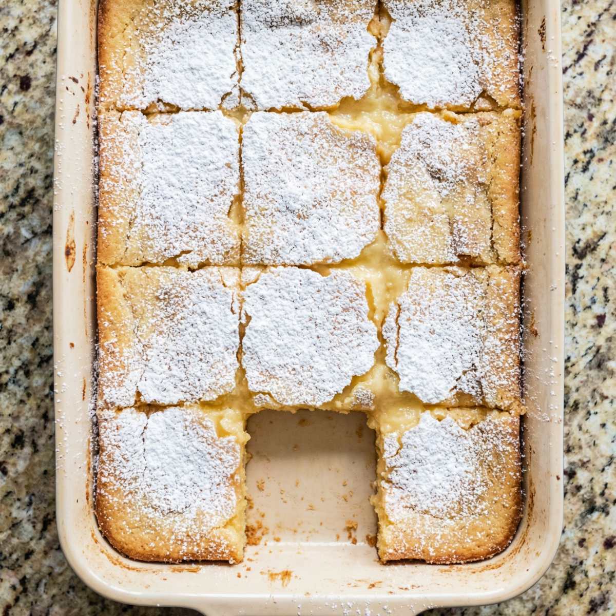 Let cool completely in the pan. The center will sink slightly and become irresistibly gooey. Dust generously with extra powdered sugar, slice into squares, and serve.