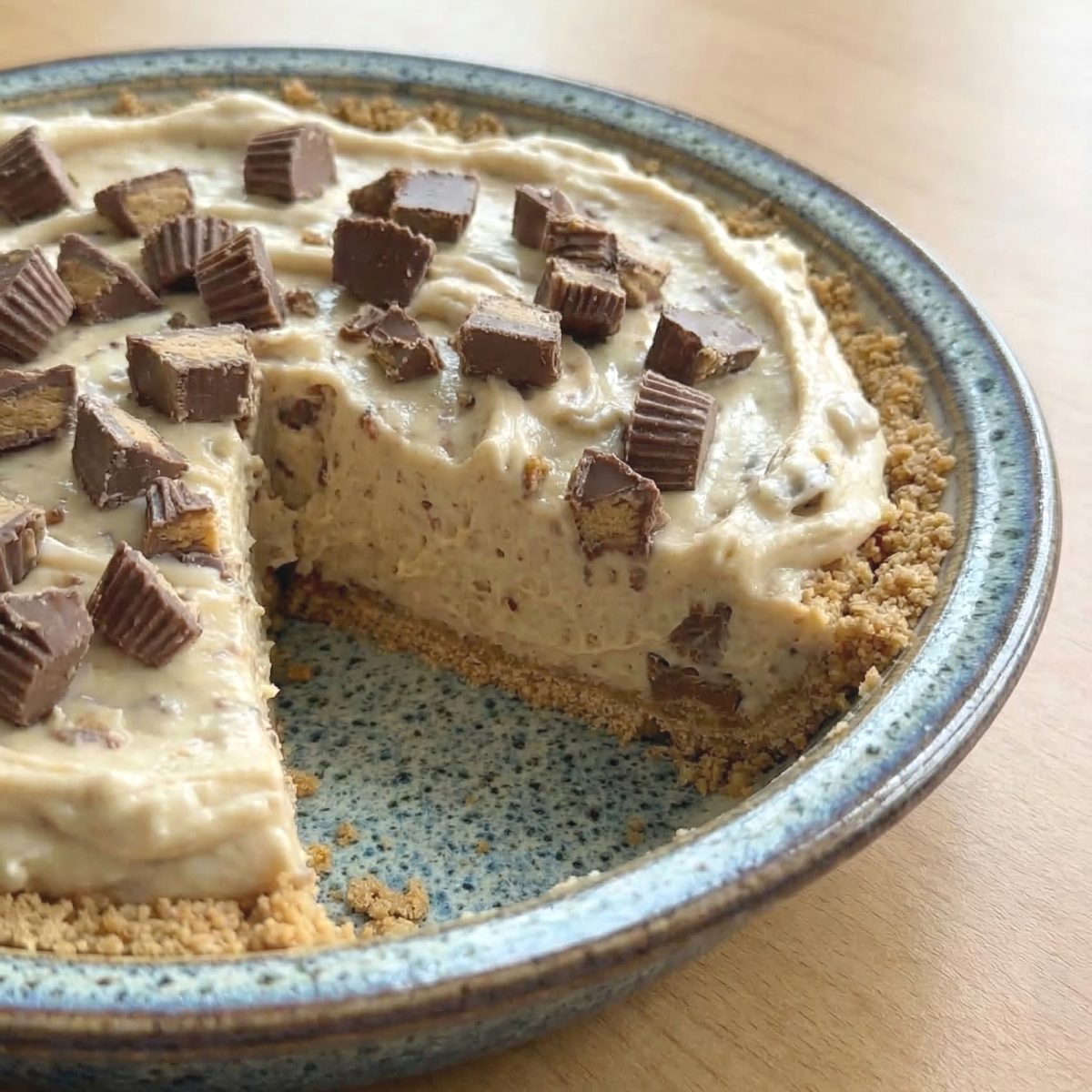 Pour the filling into the prepared crust, smooth the top, and sprinkle with remaining peanut butter cup pieces.
