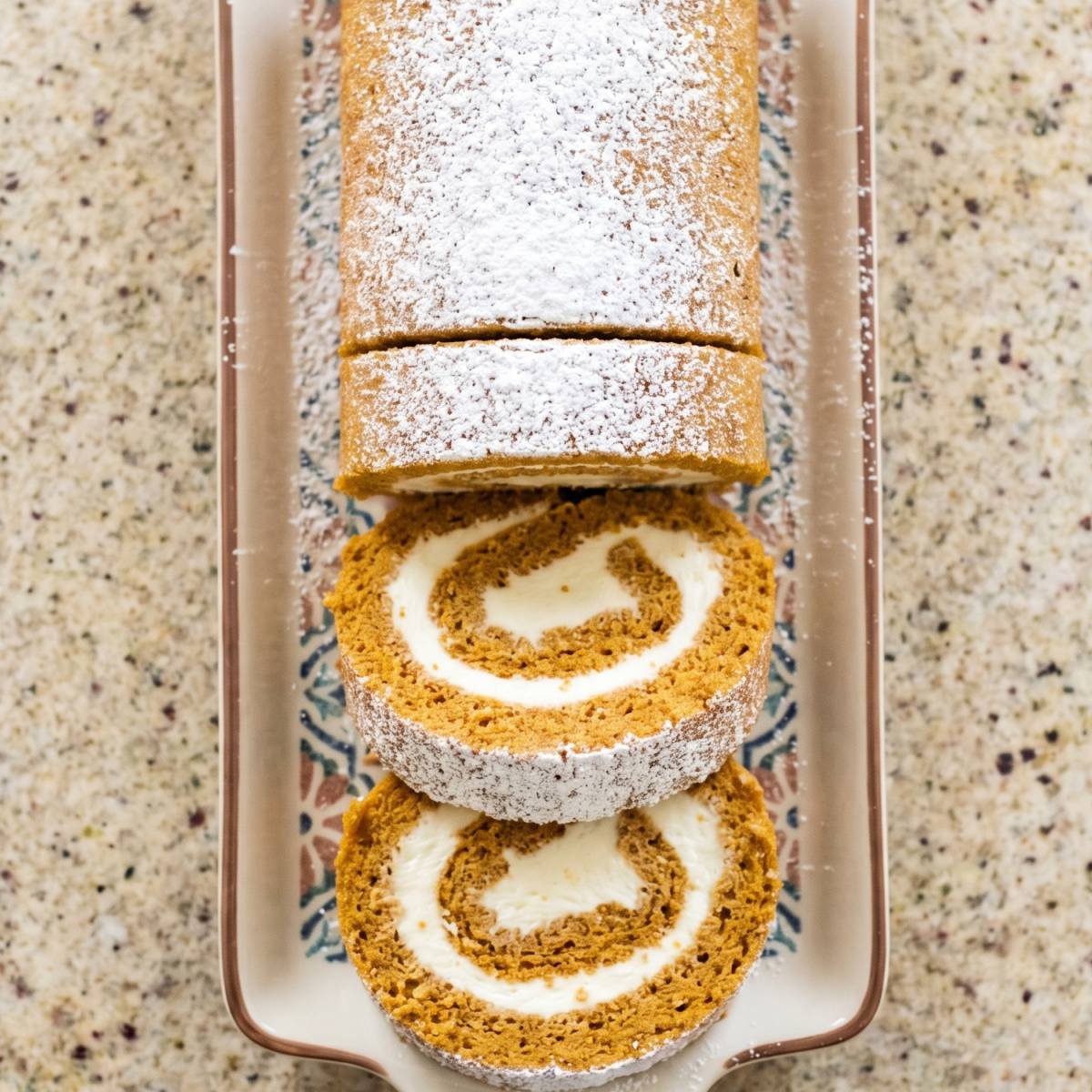 Wrap the pumpkin roll tightly in plastic wrap and refrigerate for at least 2 hours or overnight. Before serving, dust the top with additional powdered sugar and slice into 1-inch rounds.