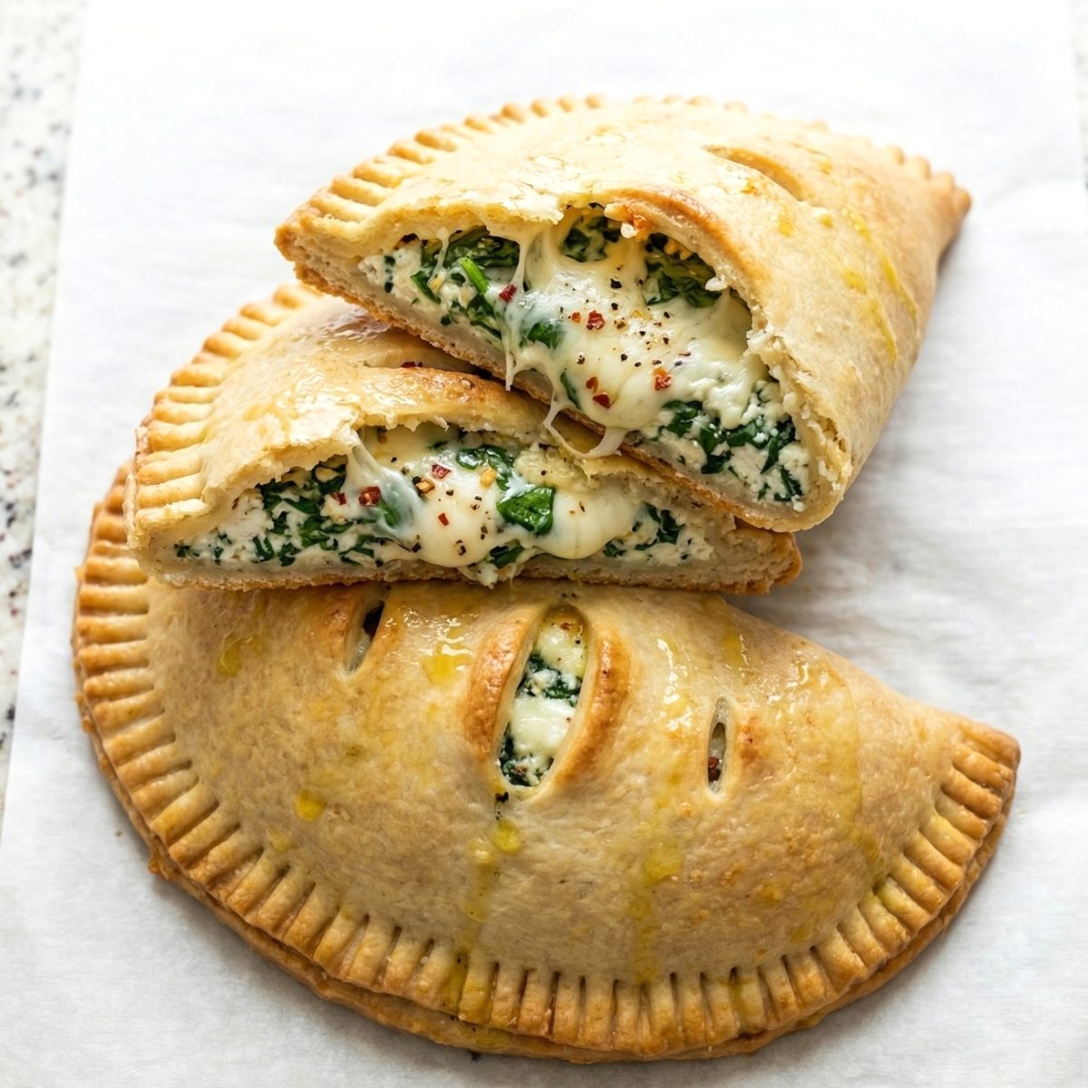 Place about 1/3 cup of filling on one half of each round, leaving a 1/2-inch border. Fold the dough over the filling and press the edges firmly to seal, then crimp with a fork. Place on the baking sheet and cut 2 small slits on top of each calzone.
