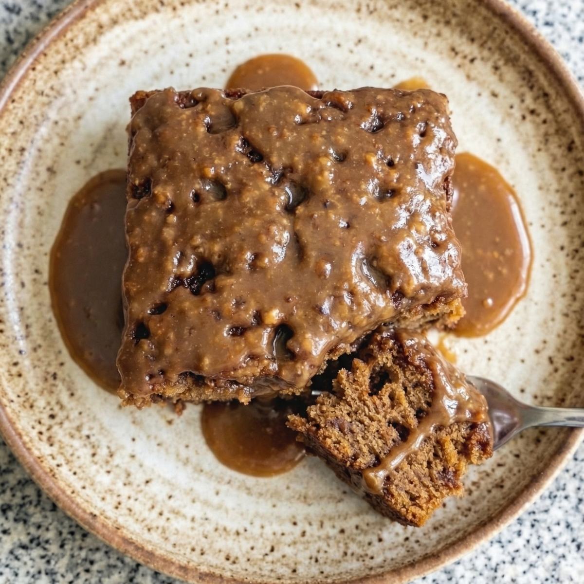 Poke holes all over the warm cake and pour half the toffee sauce over the top. Serve warm with the remaining sauce drizzled on individual slices.