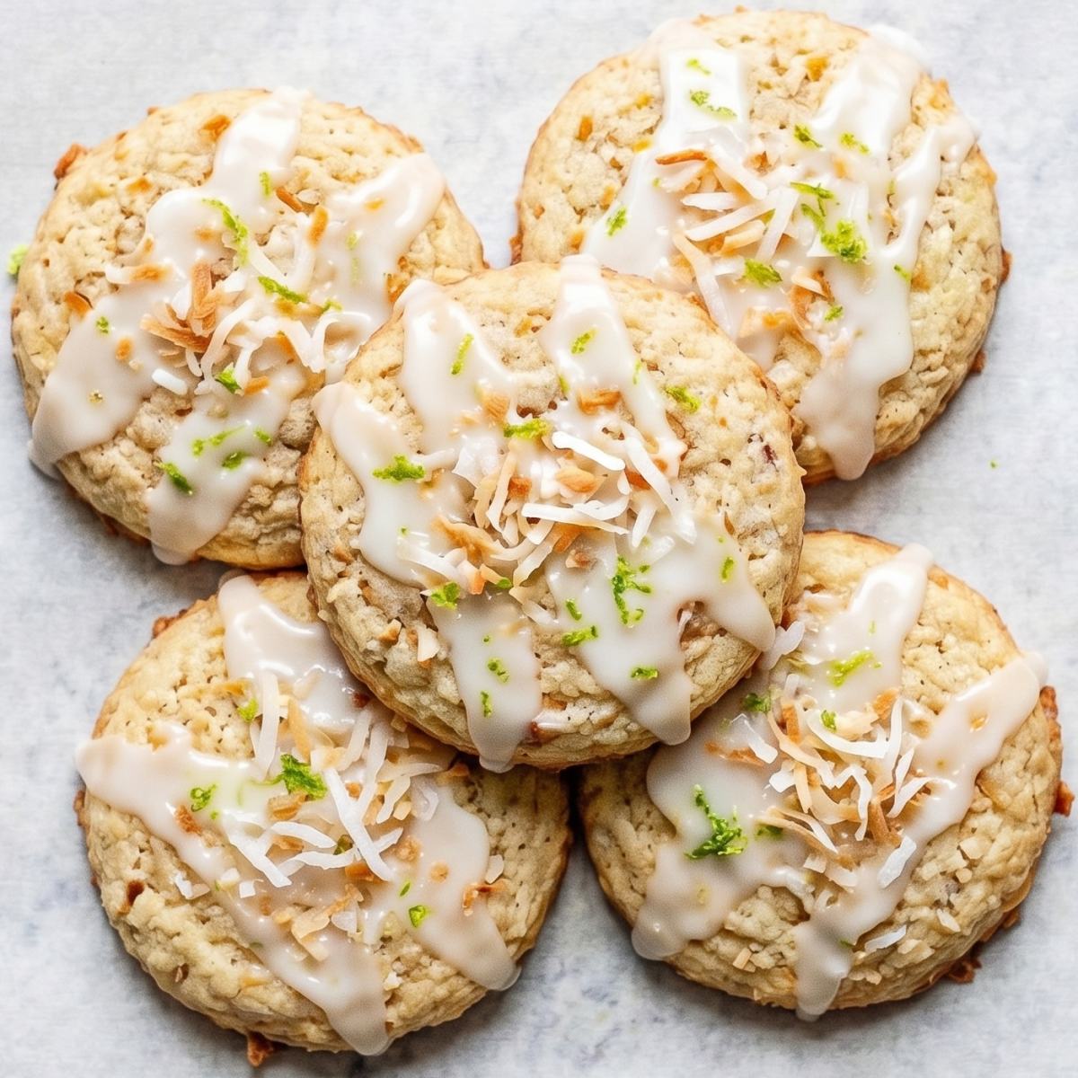 Whisk together powdered sugar and 2 tablespoons lime juice until smooth and pourable. Spoon or drizzle the glaze over each cooled cookie, then top with a sprinkle of additional toasted coconut and a pinch of lime zest. Let the glaze set for 15 minutes before serving.