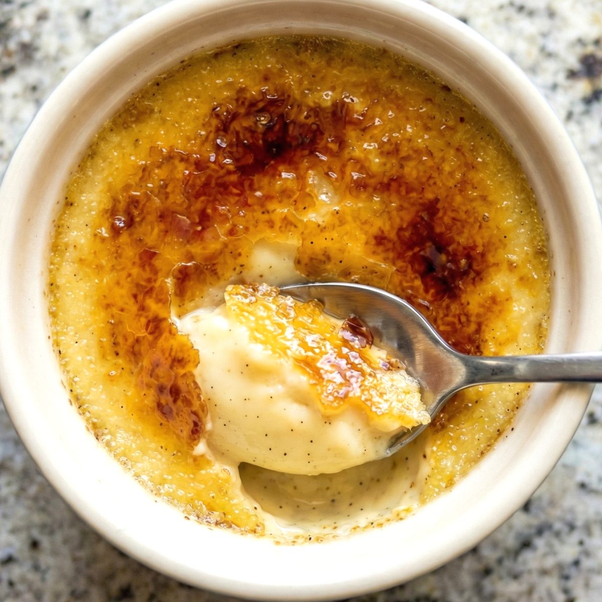Before serving, sprinkle 1 tablespoon of granulated sugar evenly over each custard and melt with a kitchen torch until a dark amber sugar crust forms.