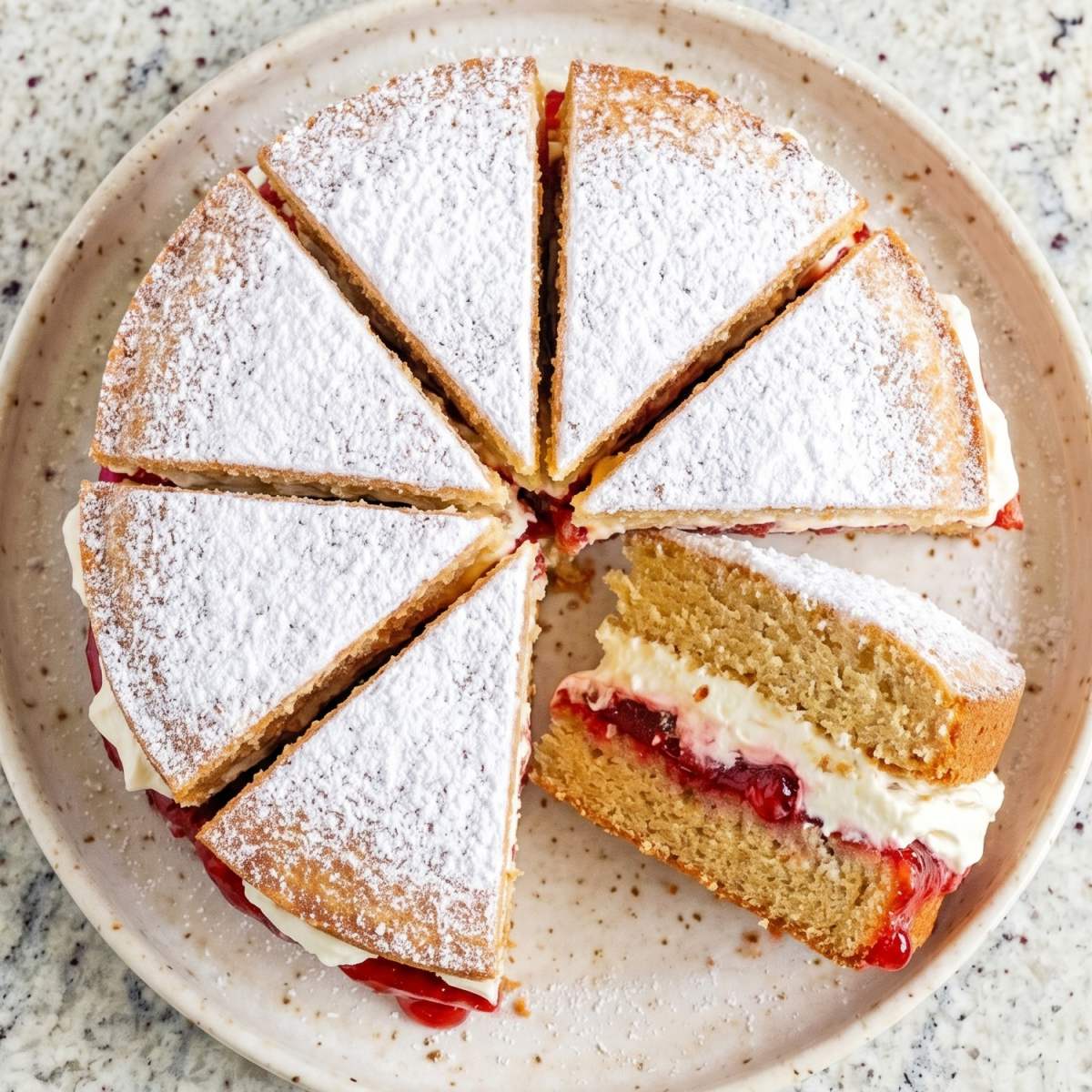 Place one cake layer on a serving plate. Spread the strawberry jam evenly over it, then spread or dollop the whipped cream on top of the jam. Place the second cake layer on top and dust generously with powdered sugar. Serve at room temperature.