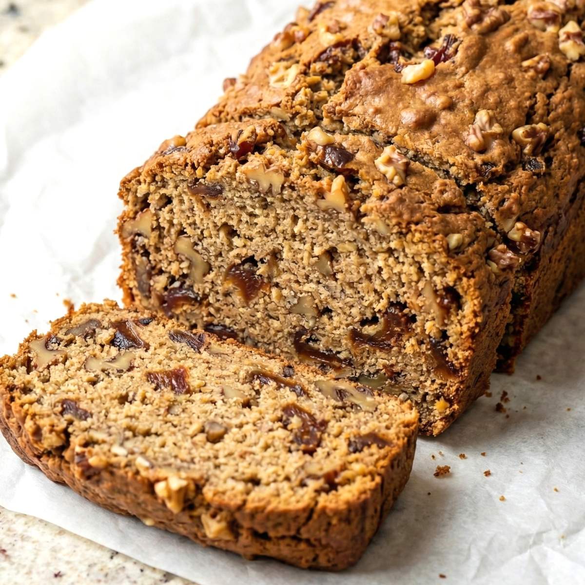 Keyword: gluten-free, paleo bread, quick bread, walnut date bread